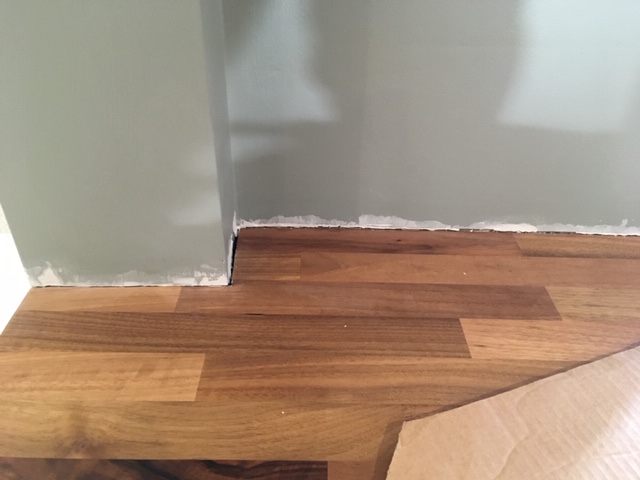 If the line is big enough, like a half inch by an 1/8 or more, make another. I am not going to paint or stain over this filler,just gluing my finish planking down. For minor gaps and correct joints use the more fluid gorilla type. For big gap filling capacity use tubes of pur glue. Install the baseboard and shoe moulding to.